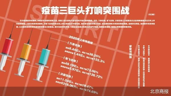 在分别遭遇净利暴跌、中报首亏与营利双降之后,疫苗三巨头围绕产品与市场开始打响突围战。近日,万泰生物、智飞生物、沃森生物三大疫苗龙头企业相继披露2025年上半年业绩报告:万泰生物净利润同比暴跌155.3%,与智飞生物双双出现上市以来的首次中报亏损,沃森生物虽未陷入亏损,但也面临营收与利润双降的局面。业绩承压背后,是疫苗市场竞争加剧、公众接种意愿阶段性波动等多重压力的叠加。面对当前市场环境,三家企业也通过布局九价HPV疫苗、拓展业务结构、加速出海等策略积极求变。